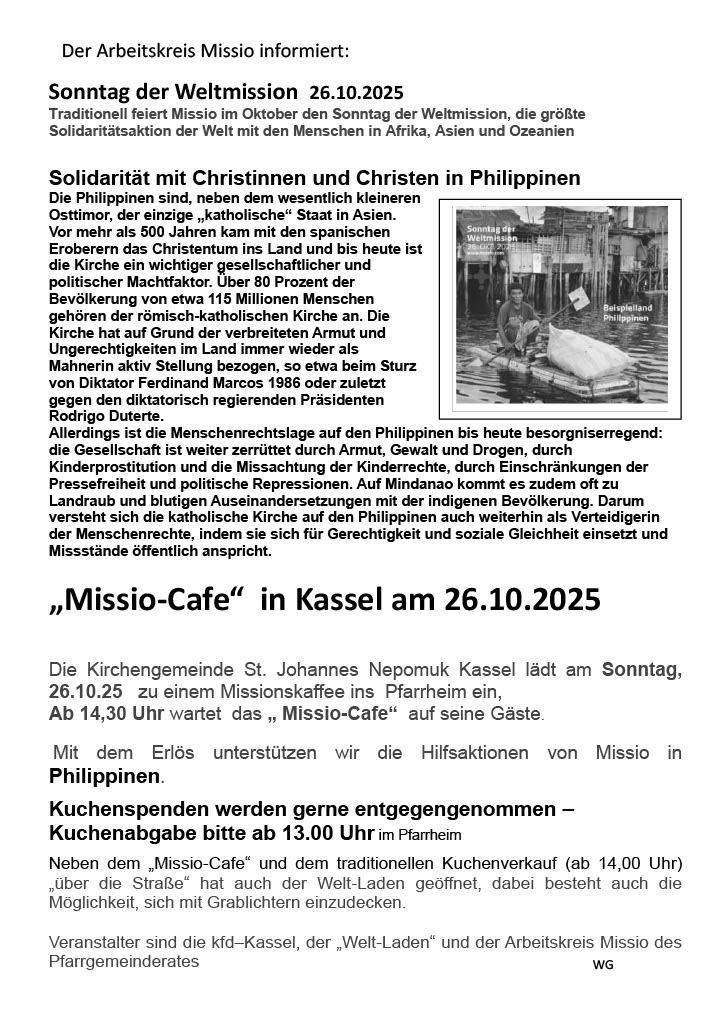 Am vergangenen Sonntag trafen sich wie jedes Jahr im Monat der Weltmission im Kässeler Pfarrheim viele Menschen , um mit anderen beim Nachmittagskaffee zusammen zu sitzen und das auch noch für einen guten Zweck.