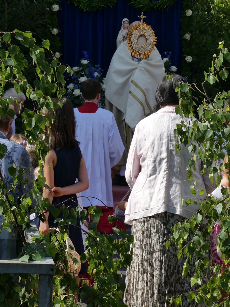 Am Do. 19.6. feierten wir das Hochfest Fronleichnam mit anschließender eucharistischer Prozession zu den 4 Altären rund um in der Kirche.