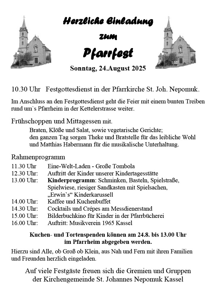 Auch das „53 Jahre Pfarrfeste in Kassel“ startete traditionell am Sonntag 24.08.25. um 10,30 Uhr mit einem eindrucksvollen, fröhlichen Festgottesdienst in St. Joh. Nepomuk Kirche und den Ehrungen der Messdiener,
