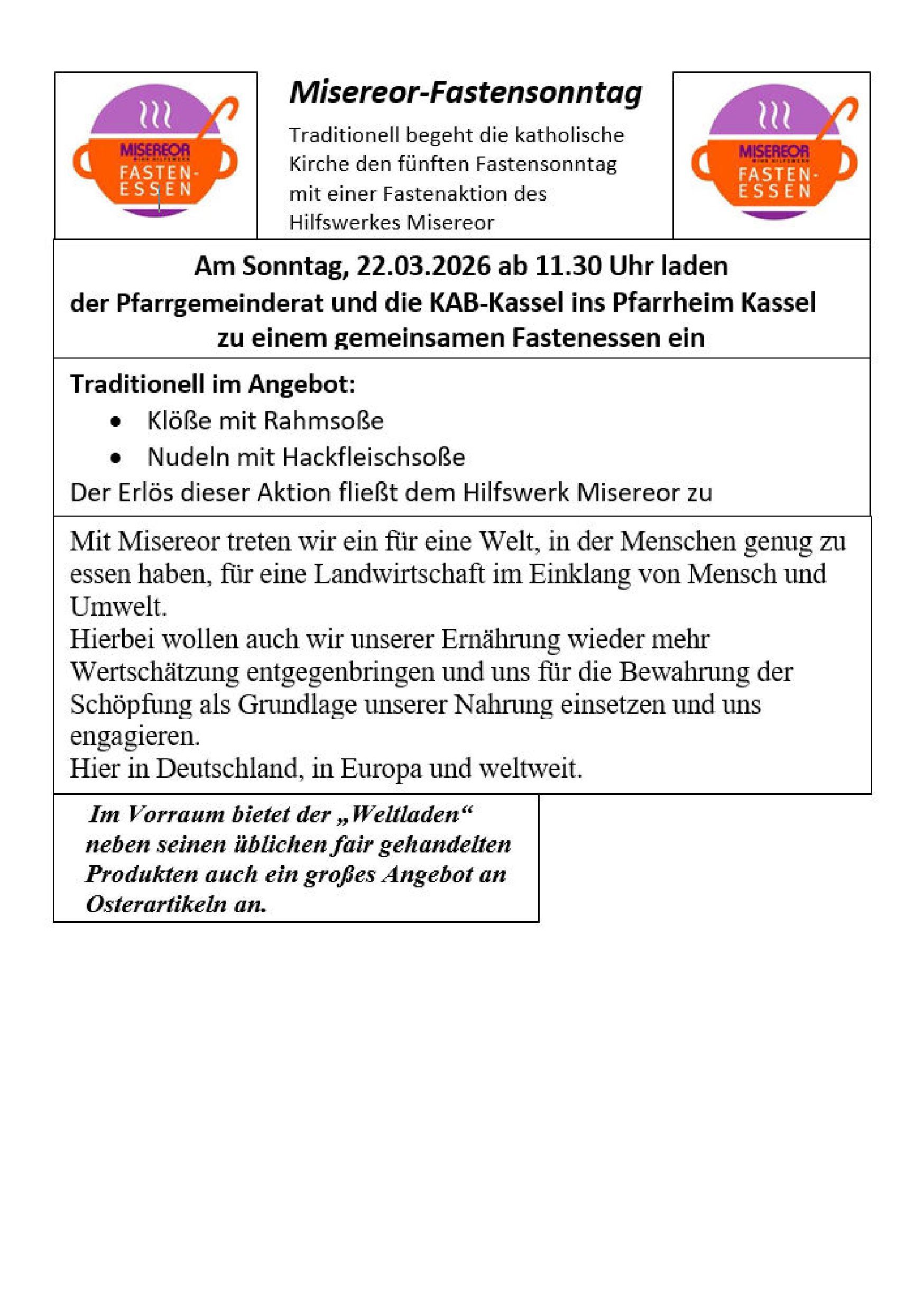 Am Sonntag, 22.März 2026 ab 11,30 Uhr laden der Pfarrgemeinderat und die KAB-Kassel ins Pfarrheim Kasse, zum traditionellen Fastenessen ein.
